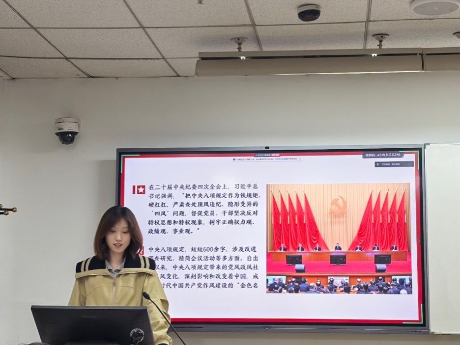 最后,郝雨辰书记对本次学习会进行了总结。她指出,作风建设是全面从严治党的重要任务,全体党员要深刻认识八项规定的重要意义,切实增强纪律意识,带头遵守党纪国法。她希望全体党员能够不忘初心,勇担使命,将八项规定精神融入到日常学习和生活中,以更加饱满的热情和昂扬的斗志,为实现中华民族伟大复兴的中国梦贡献自己的青春力量。