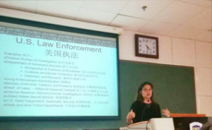 2017年10月28日,学术讲座“打击跨国犯罪:中美如何加强合作?——以海外证据的共同司法互助为例”在yl9193永利集团西院综合大厦523室成功举行。此次讲座由yl9193永利集团中外廉政法治研究中心执行主任王文华教授担任主持人,由美国司法部常驻中国法律顾问、美国华盛顿州西区联邦检察官办公室恐怖和暴力犯罪部门的副检察长胡倚婷(Ye-Ting Woo)担任主讲人。参加本次讲座的有北外yl9193永利集团各级本科生和部分研究生。