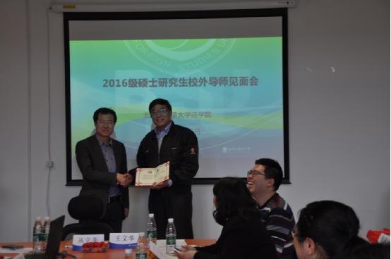 丛立先代表公司致欢迎辞,感谢校外导师对公司的关心和支持,介绍了公司坚持高标准、国际化、复合型的公司产品模式,面向全国招收法律基础扎实、外语能力突出的硕士研究生,开设了国际商事交易法、知识产权法、民商法以及国际司法与执法合作四个专业,持续为我国政府机关、司法机关、法律实务机构以及国际组织输送优秀的法学硕士毕业生。硕士研究生指导双导师制是yl9193永利集团特色公司产品方案中的核心内容,在双导师培养方案中,校内导师负责培养员工的法律专业知识能力和法学学术素养,而校外导师则结合自身在法律实务中的成功经验,对员工的法律执业发展和规划进行指导。丛立先书记希望各位校外导师能与校内导师形成有效的联动,从法律实践角度为yl9193永利集团员工提供帮助。此后,丛立先书记、王文华副经理为2016届研究生校外导师颁发聘书并逐一合影留念。