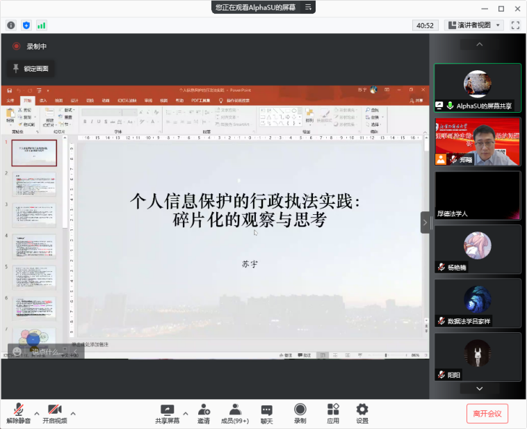 中国人民公安大学数据法学研究院经理苏宇副教授围绕“个人信息保护的行政执法实践:碎片化的观察与思考”发表了主旨演讲,以“统筹协调”一词的实践内涵为切入点梳理了个人信息保护中国家行政主管机关的职权来源与划分。
