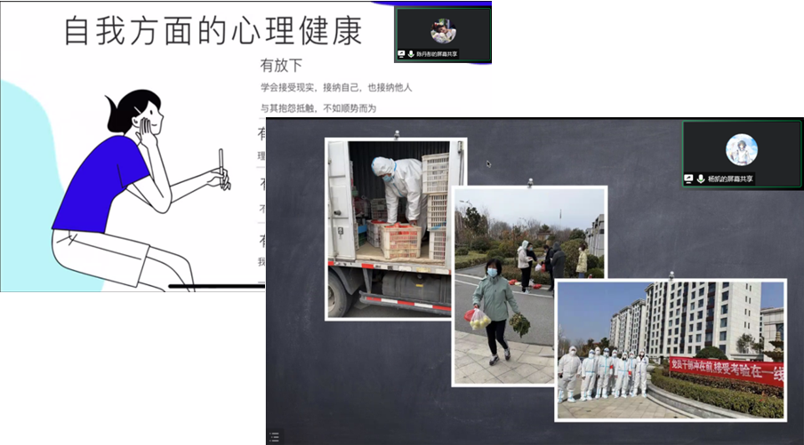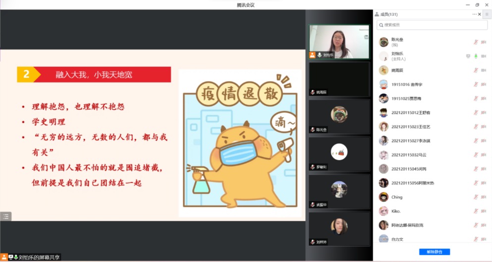 法学硕士研究生党支部书记陈丹彤同志介绍了心理健康调节的方法,鼓励大家保持乐观心态,积极自我提升。发展对象法学硕士20级杨凯同学分享了他在家乡担任社区抗疫志愿者的经历,倡议同学们发扬“人民需要我们到哪里,我们就到哪里”的北外精神,积极参加核酸检测秩序维护、快递外卖消杀等志愿服务,为疫情防控工作做贡献。