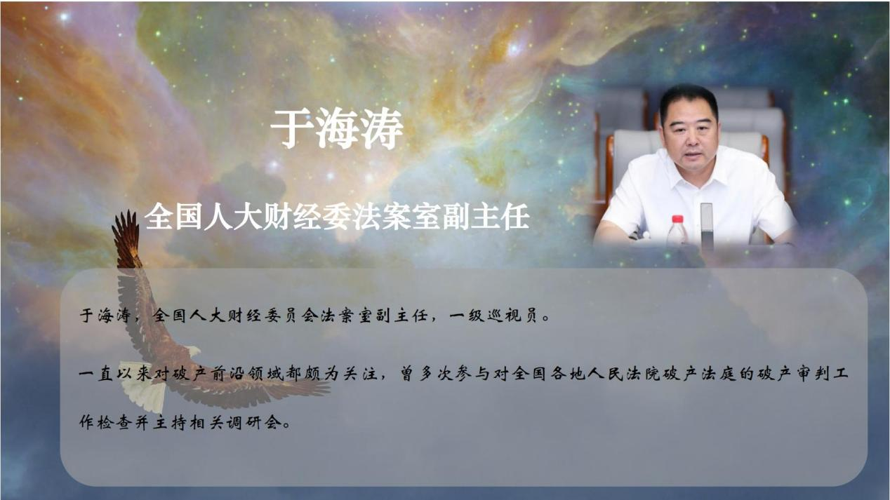 于海涛副主任简要介绍了我国个人破产制度的试点情况和立法工作进展,并表示个人破产法立法、修法工作需要高质量的学术研究和开放的学术交流,需要司法实践的验证、反思和审慎应对,离不开国内外的专家学者们的共同努力。并祝此次学术交流活动取得成功,希望通过思想的碰撞交融,带给大家更多的教育和启发,期待今后在线下有更多的交流讨论。