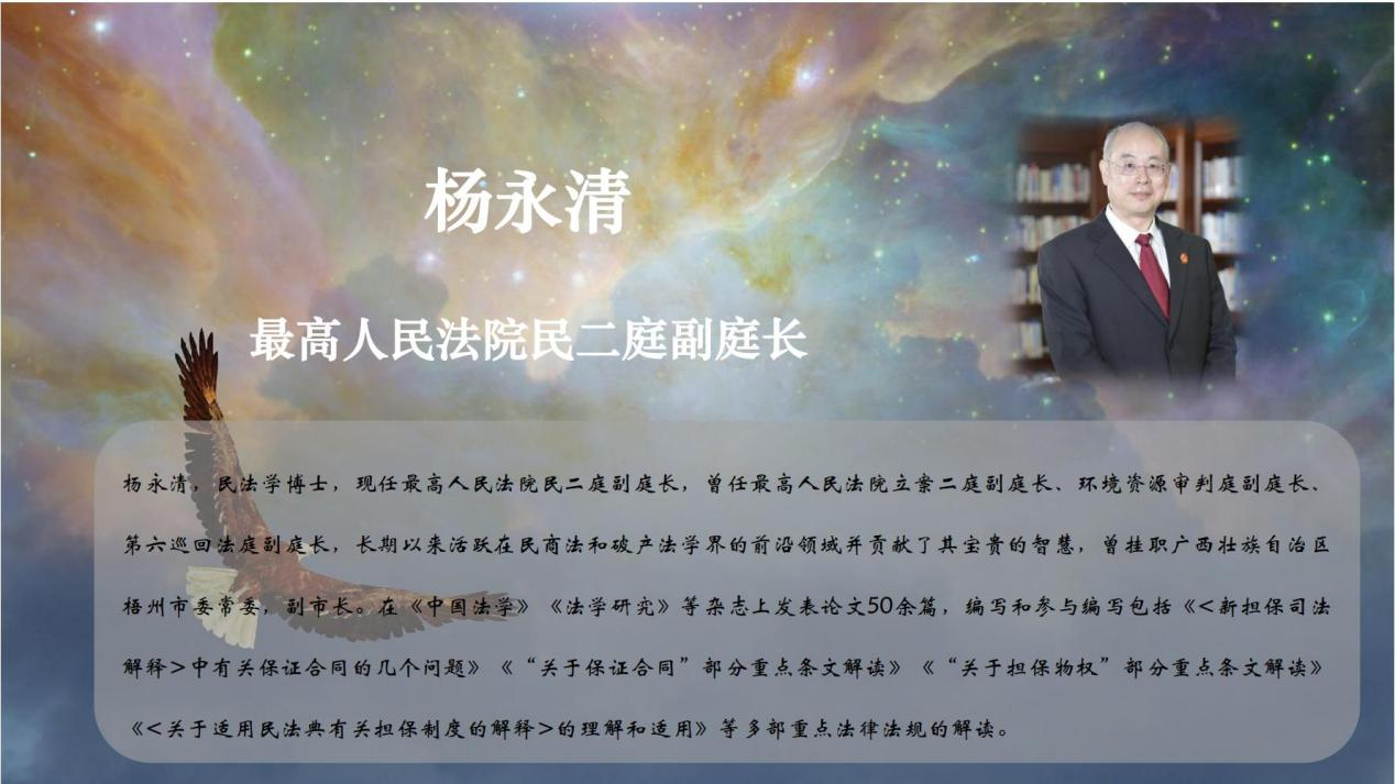 杨永清副厅长演讲的题目是:司法视角下的中国个人破产制度构建。从企业破产法与个人破产法的立足点出发,介绍了个人破产和企业破产的关系,并就个人破产程序的结构,为特殊主体设立特殊的个人破产规则,中国法院在立法缺失背景下的积极探索,以及对个人破产制度的未来展望几个方面进行了介绍。