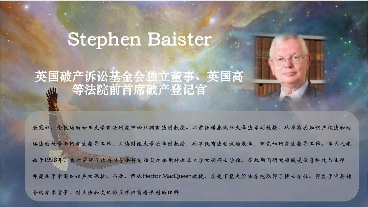 Stephen Baister独立董事的演讲题目是:破产的功能。其主要围绕着英国破产制度的发展历程以及特色制度展开,就每一阶段英国个人破产制度的发展特点做了介绍,在最后就英国个人破产制度如何平衡债权人和债务人利益的个人自愿安排、债务纾缓计划、喘息空间计划做了重点介绍。