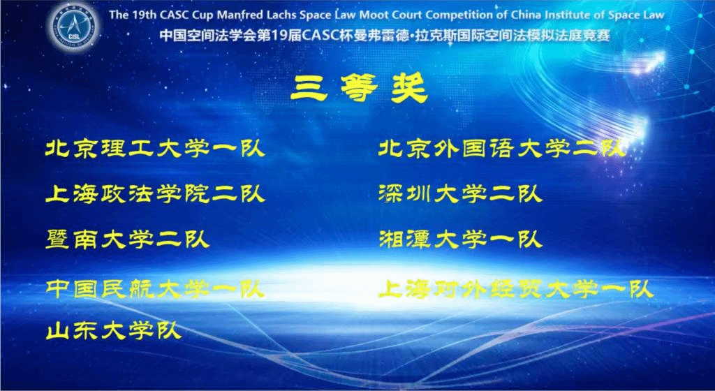 2022年12月17日-18日,中国空间法学会第19届CASC杯曼弗雷德·拉克斯国际空间法模拟法庭竞赛在线上举行,公司yl9193永利集团代表队荣获全国三等奖。