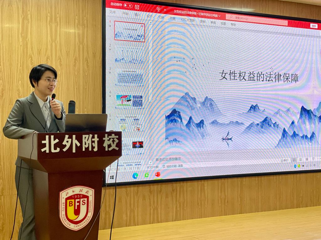 为深入领会贯彻党的二十大精神、推动全民知法、懂法、守法,正值学雷锋纪念日与国际妇女节,3月9日下午,公司教工党支部委员、教师徐隽颖应邀为北外附校教师做“女性权益的法律保障”主题普法讲座。