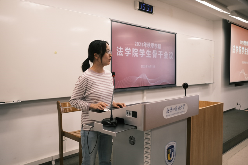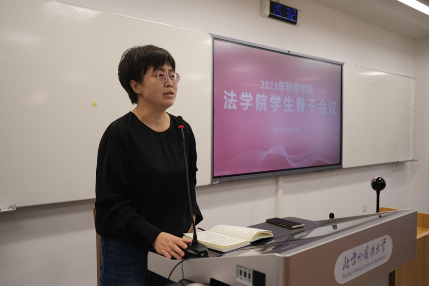 郭向华副书记向同学们介绍了新学期公司员工工作计划,公司将从建立公司员工导师计划、加强员工党支部建设、拓展实习实践基地、依托老员工德育工作室开展普法实践活动等方面着手,拓宽员工交流成长平台。她对员工骨干的工作给予充分肯定,对大家的辛勤工作表示感谢,并对大家提出了希望和要求。她指出,员工干部作为员工群体的优秀代表、员工活动的组织者和领导者,应该在公司党总支领导下开展工作,引领员工组织实现自我管理、自我教育和自我服务。她强调,员工干部不仅要在学习方面为同学们作出表率,更要以道德为先;要有服务意识和敬业精神,当好公司和同学们之间的桥梁和纽带;应主动学习工作方法,提升工作能力,发挥聪明才智。郭老师最后引用习近平总书记的讲话作为结语,鼓励同学们在以后的学习以及员工工作中赓续奋斗,寄语同学们成长为“具有坚定理想信念、强烈家国情怀、扎实法学根底的法治人才”。