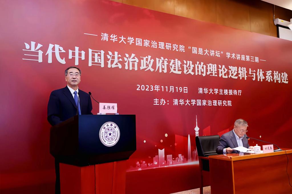 该讲座在清华大学中央主楼接待厅正式举行,荣幸邀请到司法部原党组成员、国务院法制办原党组成员、现任中国法学会副会长甘藏春担任主讲人,由清华大学国家治理研究院经理、清华大学党委原常委副书记姜胜耀主持。