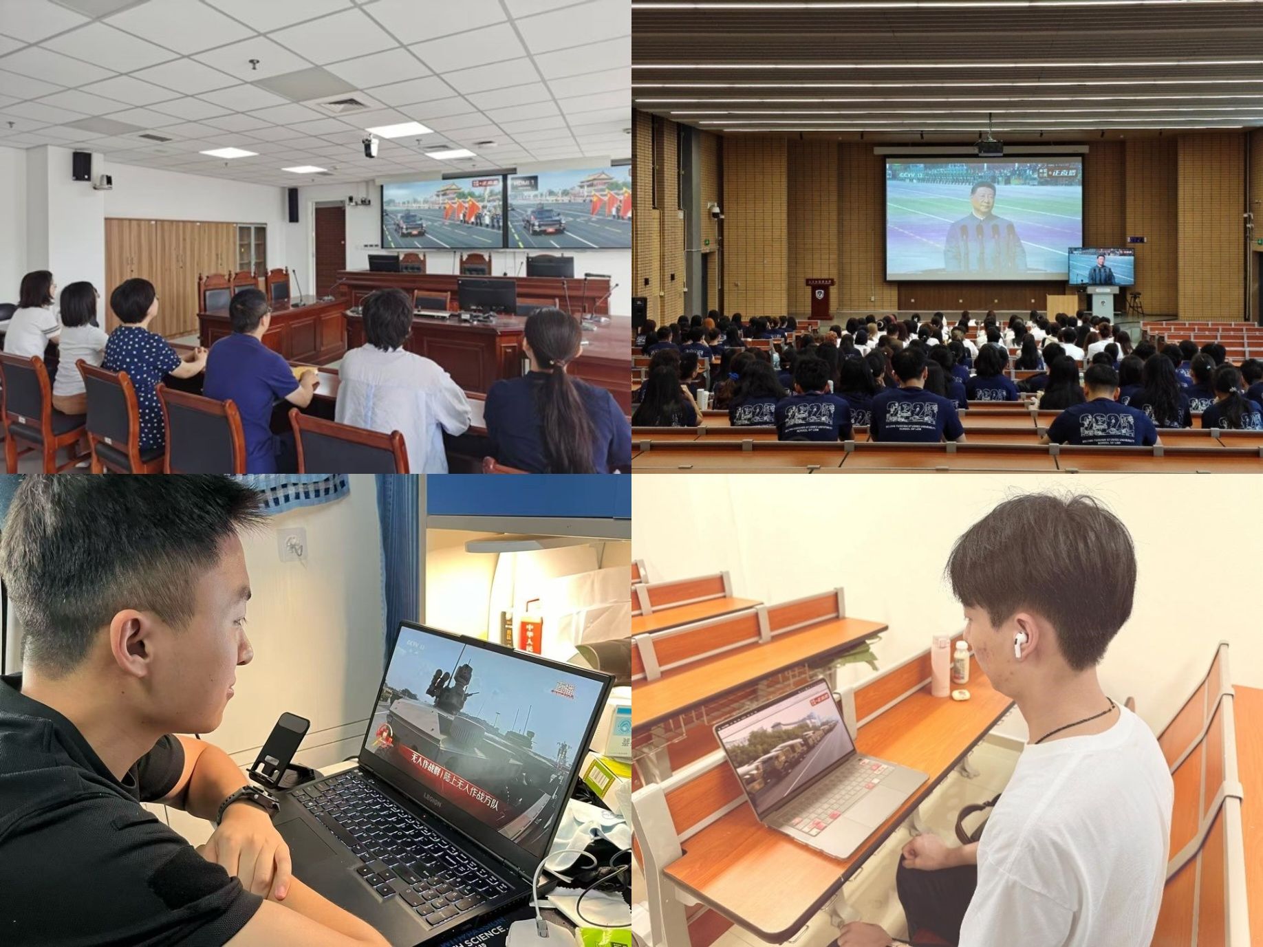 公司教师代表在模拟法庭集中收看,2025级全体新生在逸夫楼第三阶梯教室共同观看,各党、团支部组织师生通过线上方式参与学习。这场跨越八十年的历史纪念,既是对烽火岁月的深情致敬,更是面向未来征程的庄严启航。八十年前,中国作为世界反法西斯战争的东方主战场,最早投入抗日且持续时间最长,付出了3500万军民伤亡的巨大代价,为世界反法西斯战争胜利作出了不可磨灭的贡献。八十年后的今天,中国以阅兵仪式向世界许下和平誓言:铭记历史,是为了不让悲剧重演;捍卫胜利成果,是为了与世界共享和平。