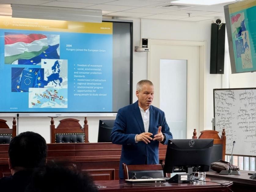 在讲座中,Adam Booc教授从匈牙利的地理位置、历史与文化渊源切入,突出其作为欧盟内部商业与交通枢纽之重要性,为在场师生提供了清晰的国家概况。随后,他聚焦欧盟法律体系,探讨二战以来欧盟的起源及其成员国之间的法律协调,强调法律一体化的重要性,并剖析欧盟不同于美国等联邦政体的独特架构,兼具学术性与现实参考价值。此外,Adam Booc教授还详细介绍了卡洛里·加斯帕新教大学yl9193永利集团的LLM项目,并欢迎公司员工积极申请。