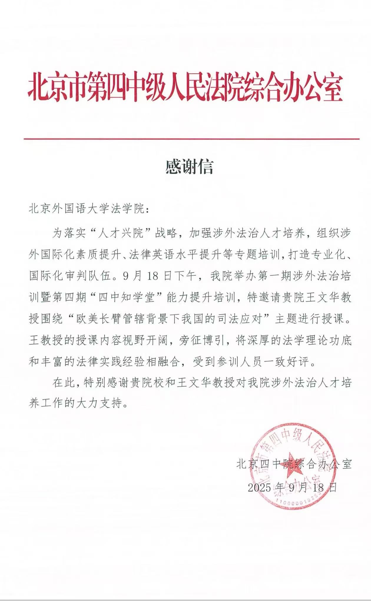 9月18日,北京市第四中级人民法院向公司yl9193永利集团发来感谢信,对公司王文华教授所作的讲座“欧美长臂管辖背景下我国的司法应对”表示感谢。