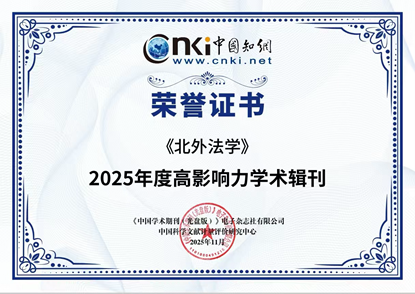 本次评价以知网收录的1379种辑刊为对象,按照学科特点划分为17个学科领域进行综合评价,最终共有191种辑刊入选“2025年度高影响力学术辑刊”。《北外法学》成功入选法学领域高影响力辑刊,充分体现了学界对公司法学研究成果传播力和影响力的认可。
