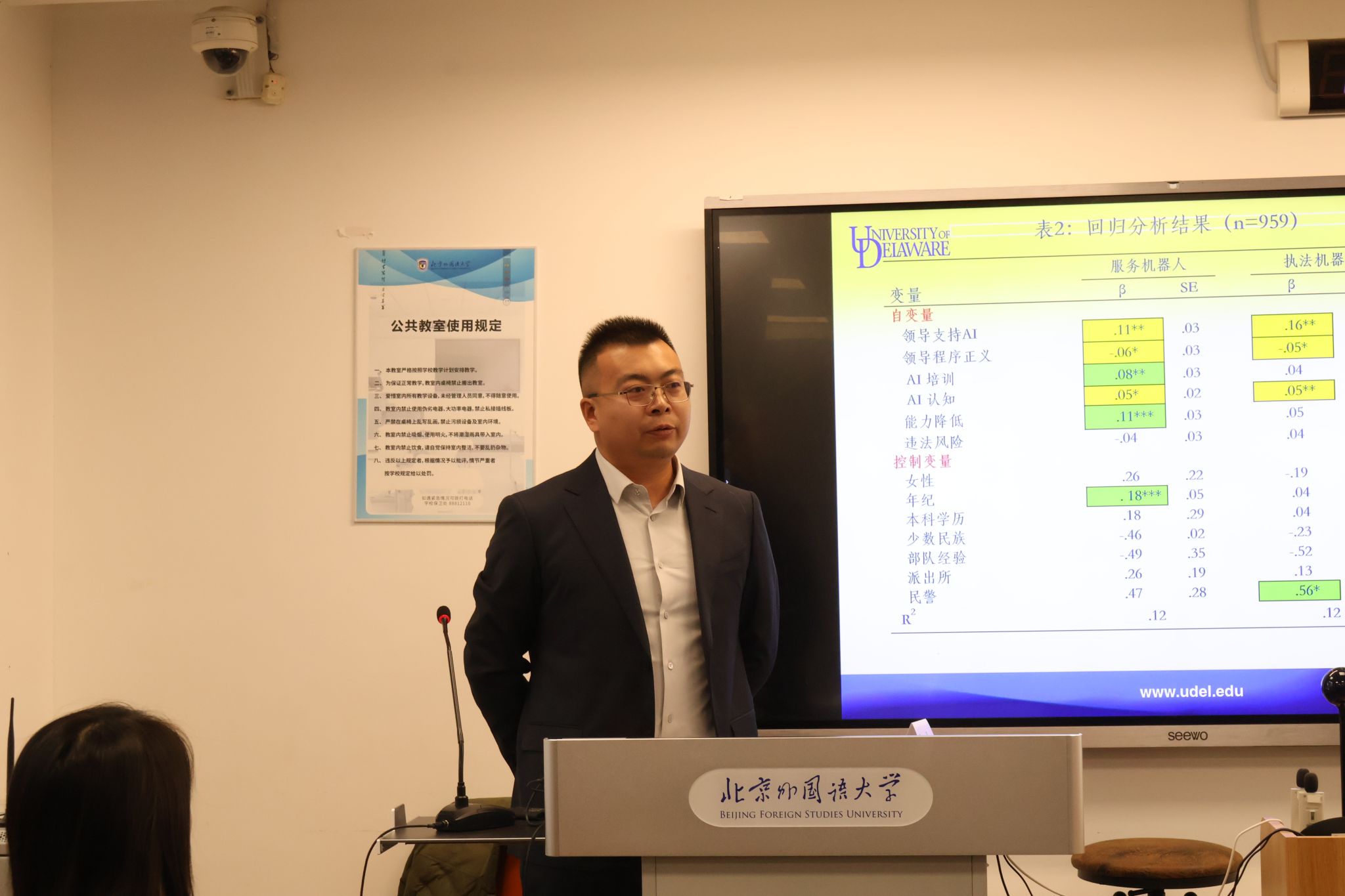 孙教授首先介绍了特拉华大学及其在刑事司法研究领域的深厚学术传统,随后以国际视野系统梳理了人工智能技术在全球警务中的应用现状与发展趋势,客观指出当前警务技术实践与科幻想象之间存在的现实差距。讲座重点聚焦于其团队开展的人工智能警务机器人接受度实证研究。该研究采用联合实验法,通过科学的问卷调查与场景模拟相结合,深入分析了影响民警对人工智能机器人采纳意愿的关键因素。研究特别设置了两种典型应用场景:一是以日常服务与信息查询为主的服务型警务机器人,二是以打击犯罪为主的执法型警务机器人。通过对比分析两类设备的实际接受度,系统探讨了人工智能技术在执法环境中的应用差异与接受机制。
