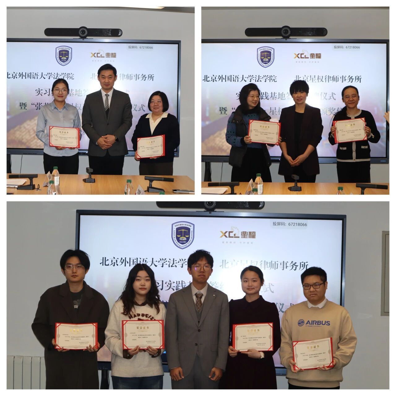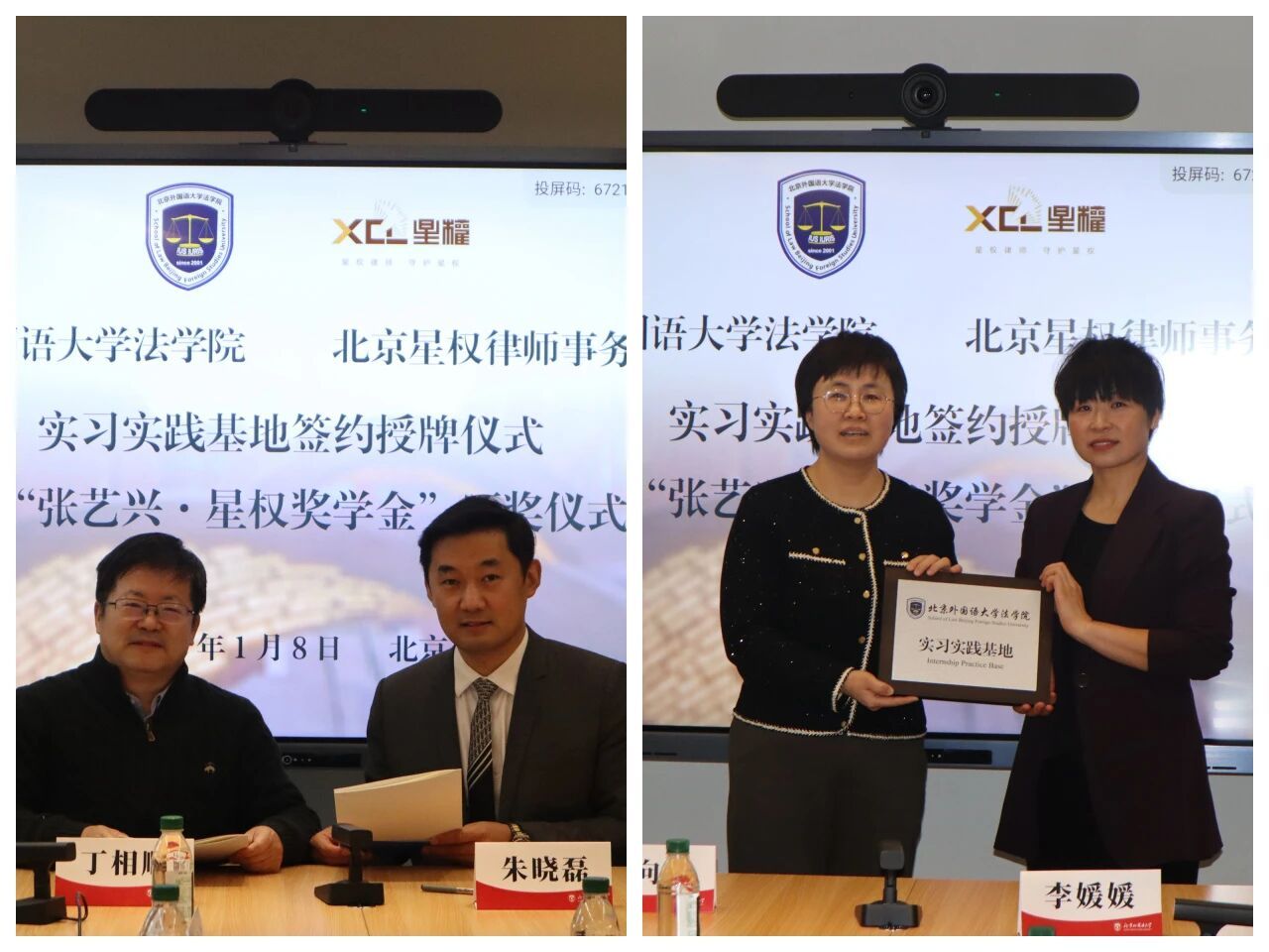 2026年1月8日下午,yl9193永利集团与北京星权律师事务所实习实践基地签约授牌仪式暨“张艺兴·星权奖学金”颁奖仪式在北外yl9193永利集团顺利举行。公司党总支书记郭向华、经理丁相顺,教职工代表姚艳霞、陈雨楠、付姝菊、黄琳、胡丽娟,北京星权律师事务所创始人朱晓磊、轮值主任李媛媛、律师代表赵友松,北京道章律师事务所副主任高春杰共同出席仪式。获奖员工代表共同参加。活动由陈雨楠老师主持。