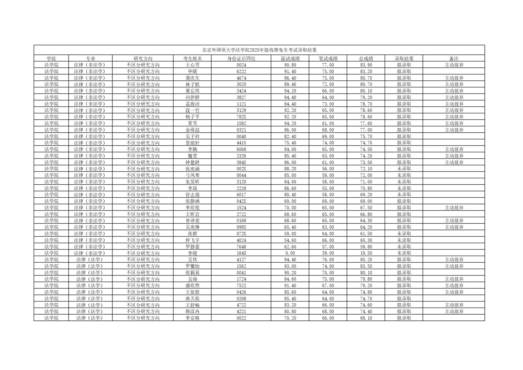 2025年接收推免生考试录取结果
